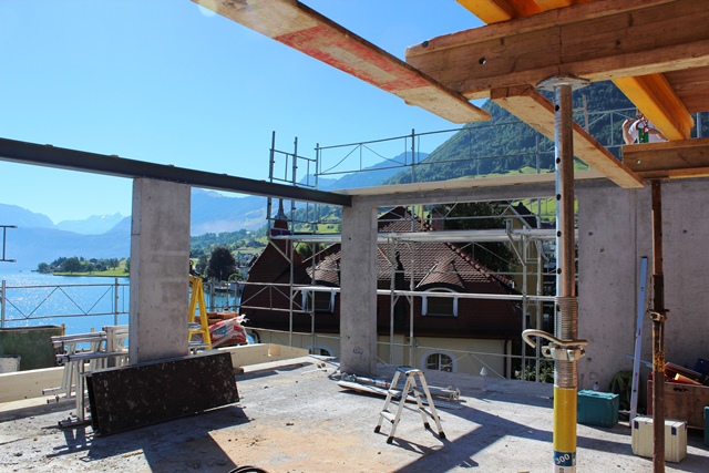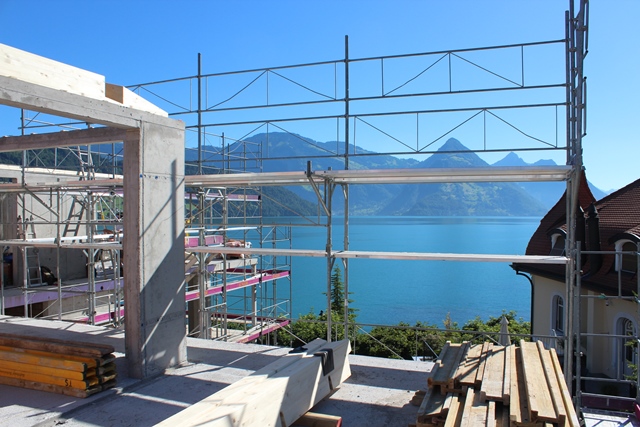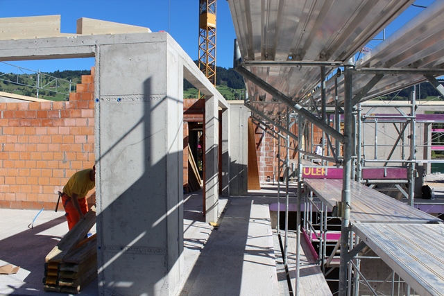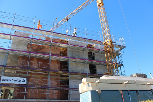 Traumwetter zum Wochenstart und perfekte Bedingungen zur Aufrichtung des Dachstuhls.